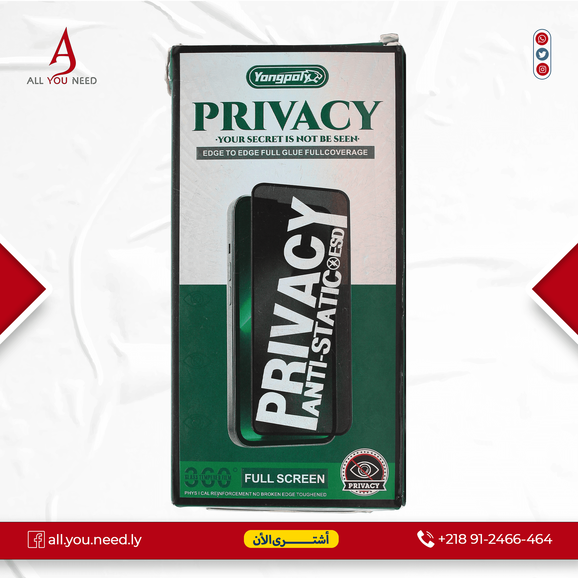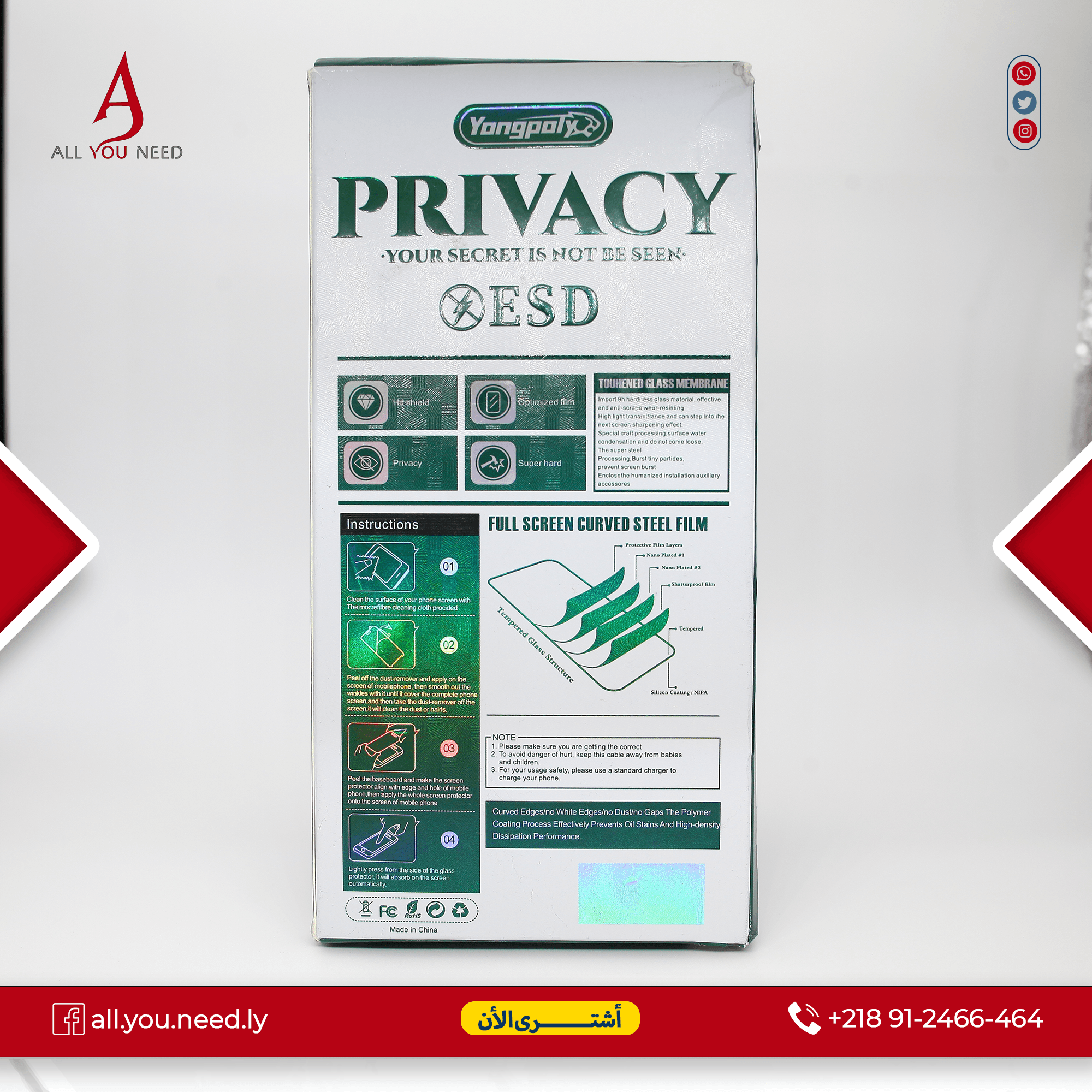 - خصوصية تامة: تقلل زاوية الرؤية إلى 45 درجة فقط من الجانبين الأيسر والأيمن، وهذا يحمي شاشة الهاتف من التجسس من الأشخاص الجالسين بجانبك.